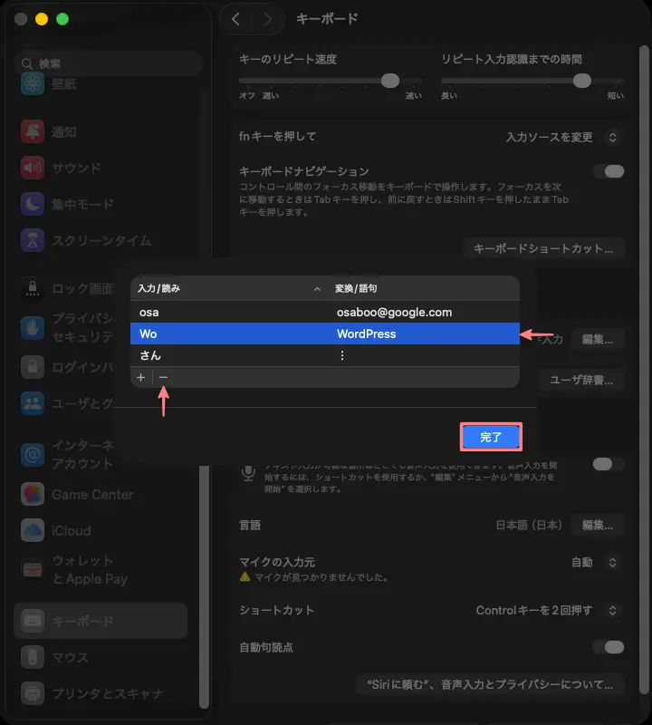 - 「システム設定」→「キーボード」→「ユーザー辞書」を開く